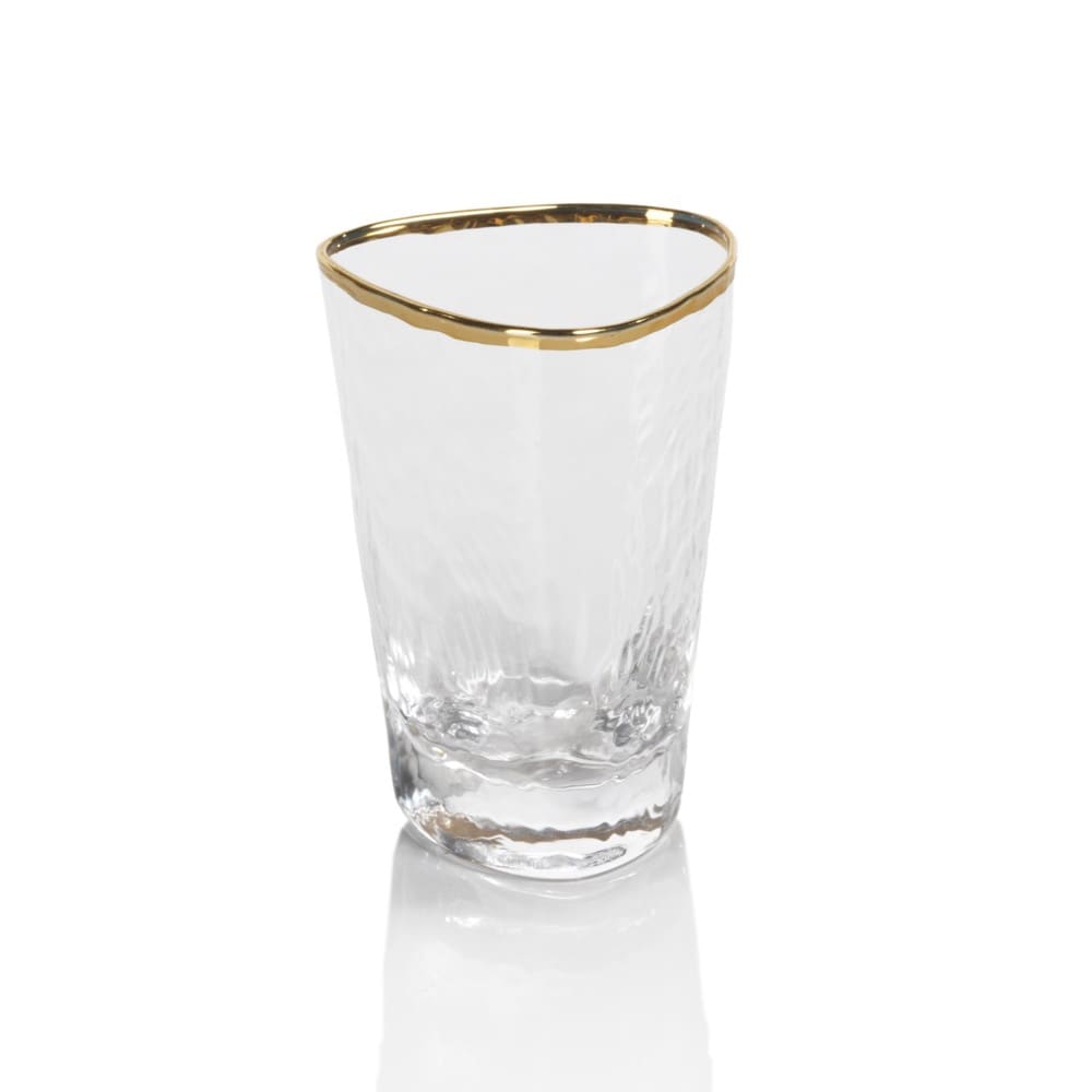 Elevate your cocktail game with these elegant Aperitivo Triangular Shot Glasses. Made from clear glass with a luxurious gold rim, these shot glasses are perfect for serving up your favorite spirits in style. The unique triangular shape adds a modern touch to your barware collection. Whether you're hosting a party or just enjoying a drink with friends, these shot glasses are sure to impress. Add a touch of sophistication to your next gathering with these Aperitivo Triangular Shot Glasses. Cheers!