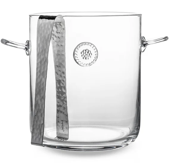 From our Berry & Thread Collection, this blown glass ice bucket with tongs is both transitional and practical to keep your bubbly or vino chilled and ready to serve. Complete with our handsome Berry & Thread medallion in the center, this piece is unmistakably classic at any function.