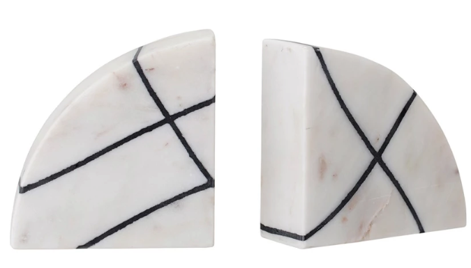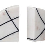 These bookends are crafted of 100% marble. The pair of bookends are the shape of a half-circle, then cut in half again to create the two bookends. The marble color is polished white with soft brown details. Above the white marble, a black line design creates a modern and geometric design.