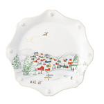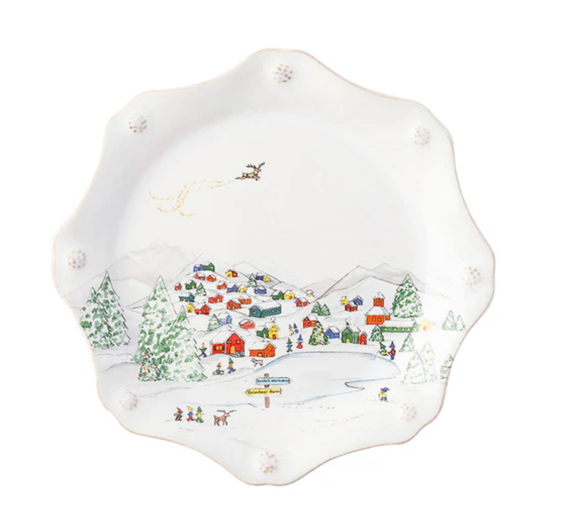 The mythical, folkloric world of the North Pole is hand illustrated atop our iconic Berry & Thread scalloped shape. Enjoy our whimsical depiction of the Elves' village, with colorful cabins dotting the Nordic landscape, complete with Rudolph flying overhead.