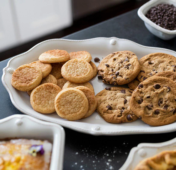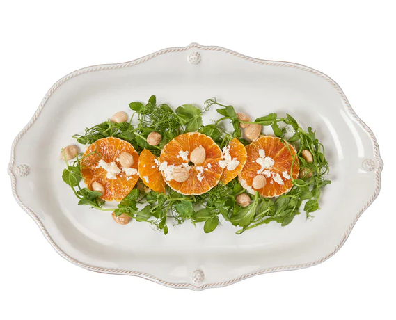 From Juliska's Berry & Thread Collection - Rimmed with a simple thread and adorned with a sprinkling of berries, this iconic dinnerware collection embraces the historic motifs of our Bohemian glassware. This 16 in platter, with a subtly scalloped edge is perfect for serving a few, or a feast and goes seamlessly from oven to table.