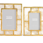 These Contemporary solid stone quartz frames are highlighted and accented with fretwork in a brass metal. The neutrality allows the frames to be placed in just about any home.