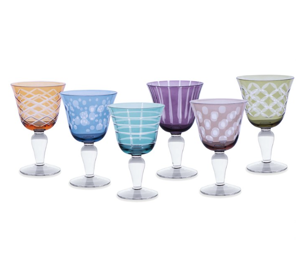 Set the bar with colorful works of art. The Carved Wine Set of 6 (Multi) from our GLASS Collection contains a half dozen masterpieces of the glassmaker's art. Each a different color and etched with a different design, a perfect glass for your favorite wine, cocktail or other beverages. Display with the GLASS Carved Double Old Fashioned Set of 6 (Multi) to increase the serving options and sales. Sold as mixed set of six, colorful glass is on-trend and has wide appeal. Dimensions: 4.5 x 4.5 x 4.5