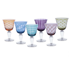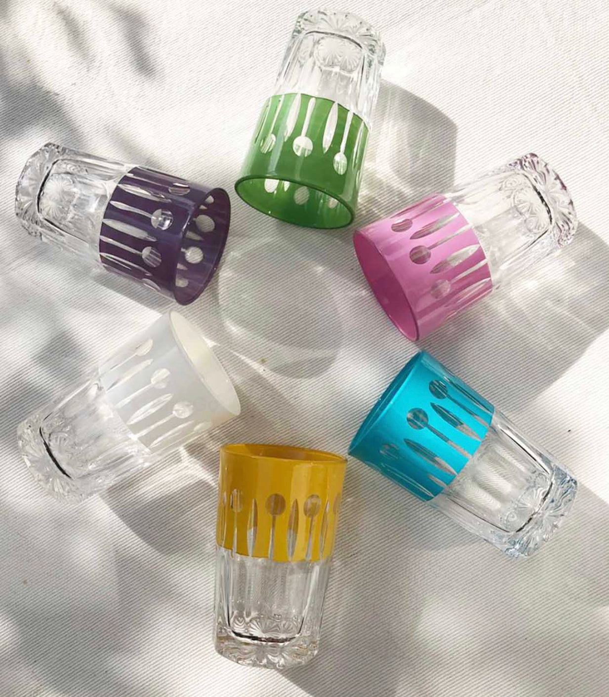 The set includes 1 glass turquoise, light green, pink, white, yellow and light purple