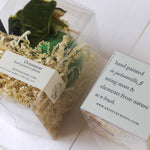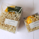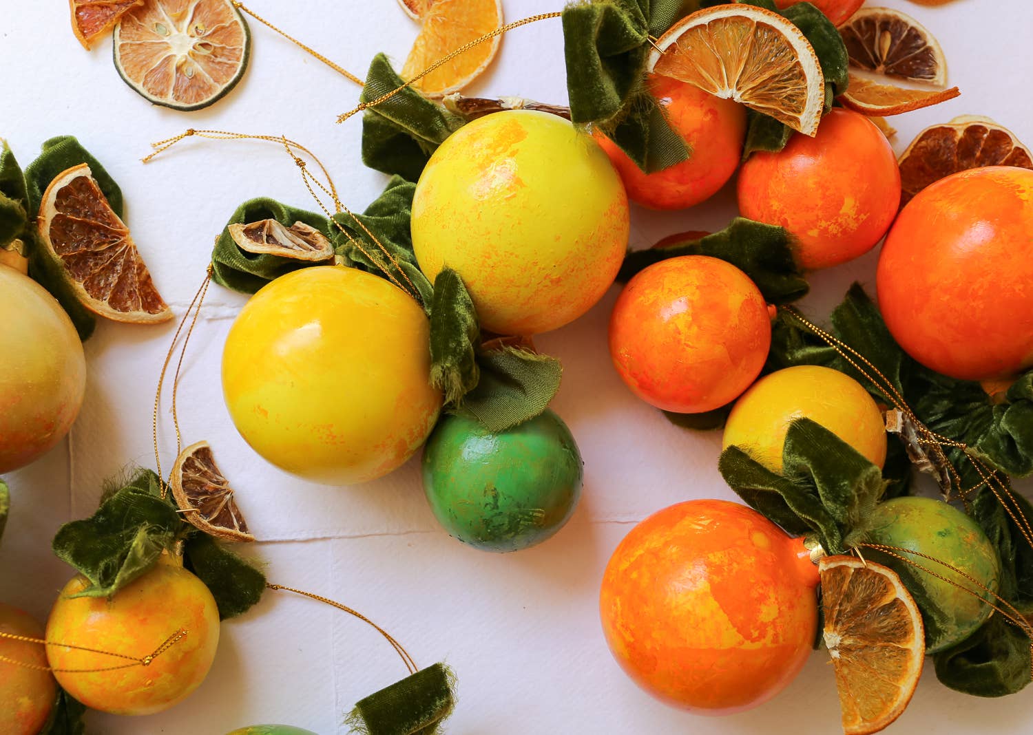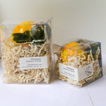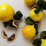 These pieces are hand painted with a lemon inspired color story, and each piece is adorned with a hand tied velvet ribbon and a dried lemon slice.