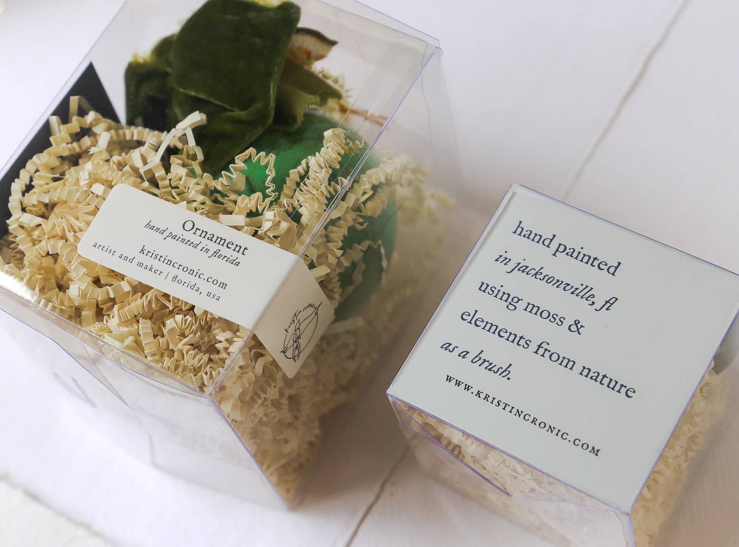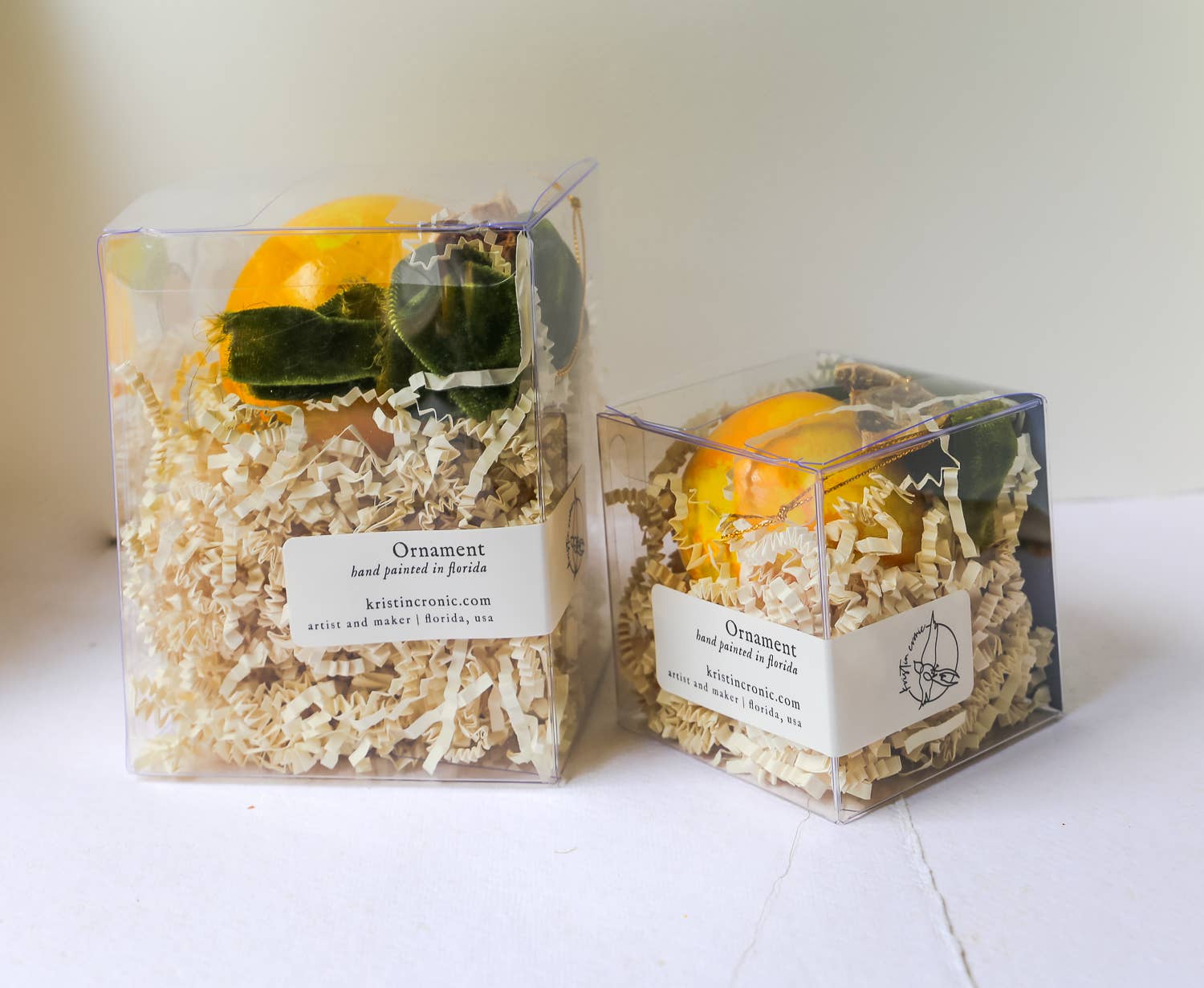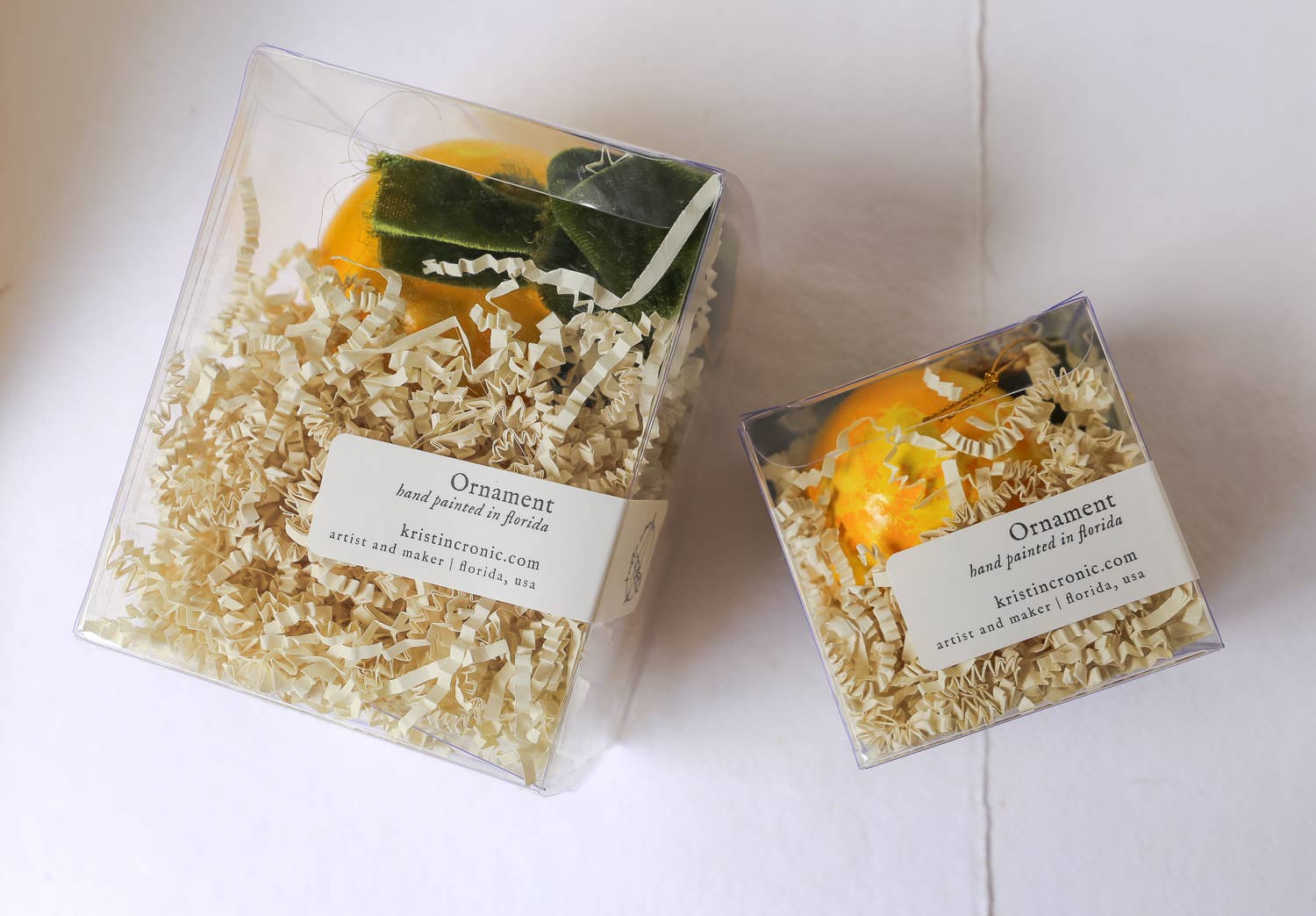 Ornaments are packaged in a clear box with crinkle paper for cushion and enough open space to see the details.