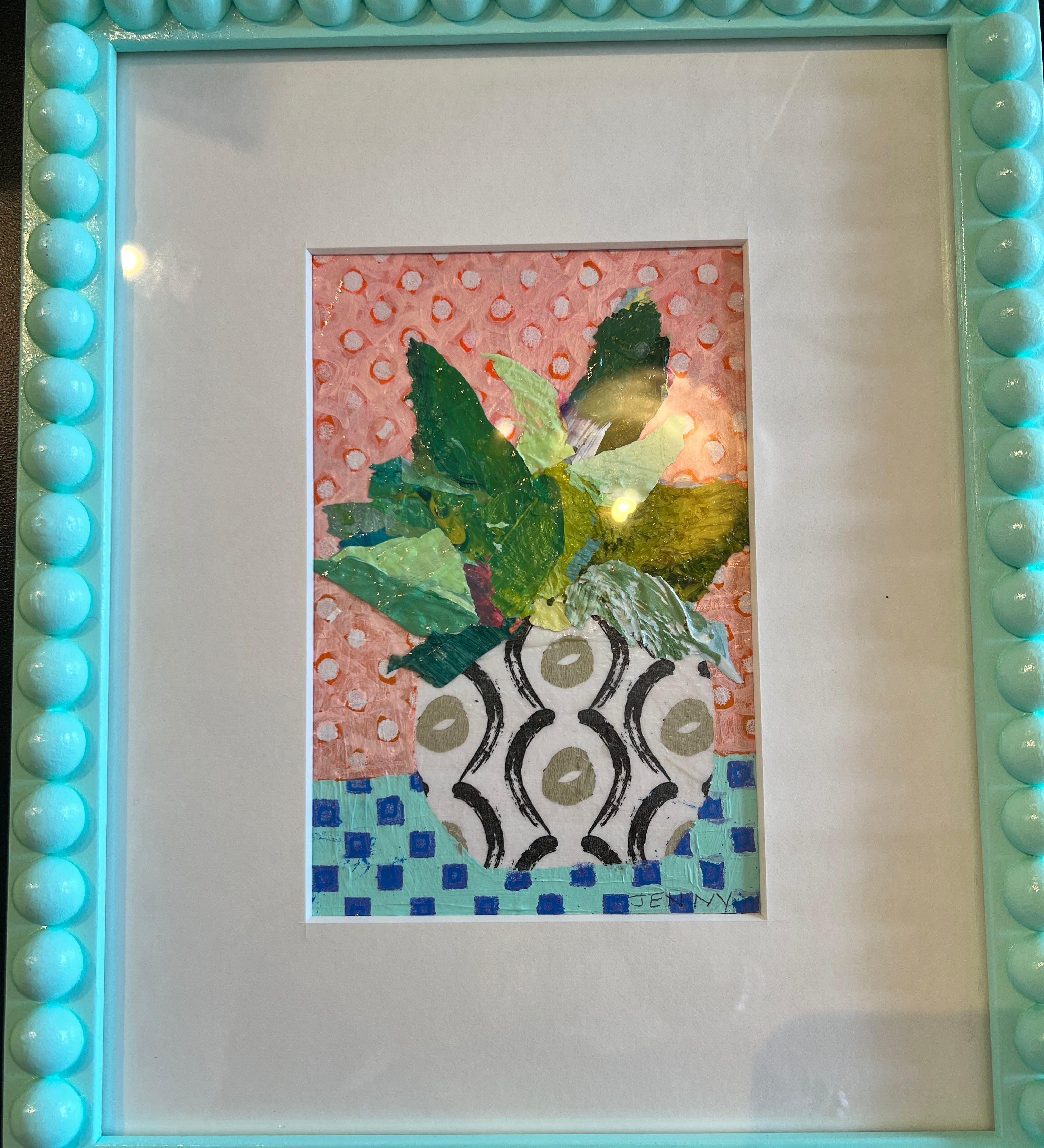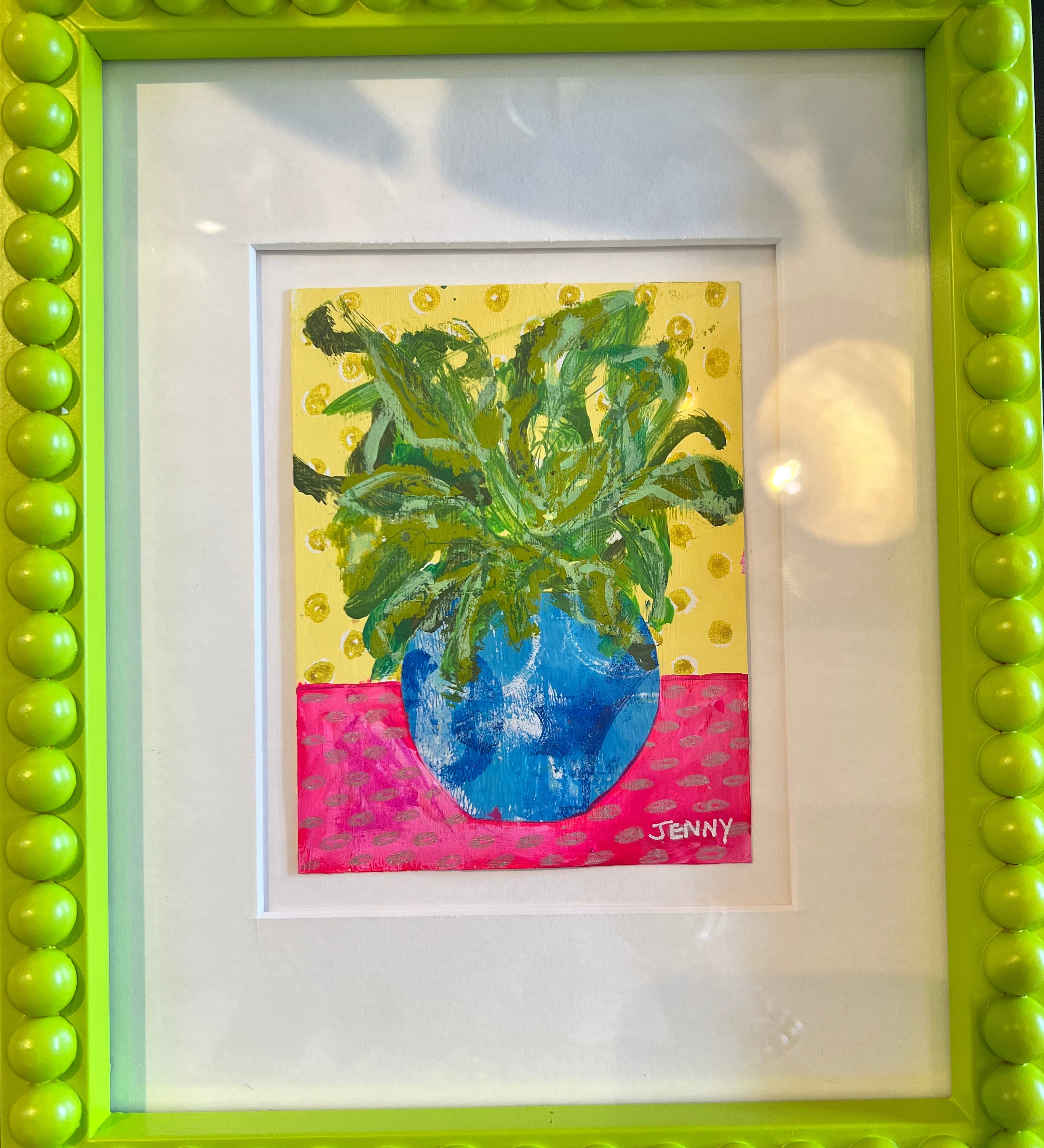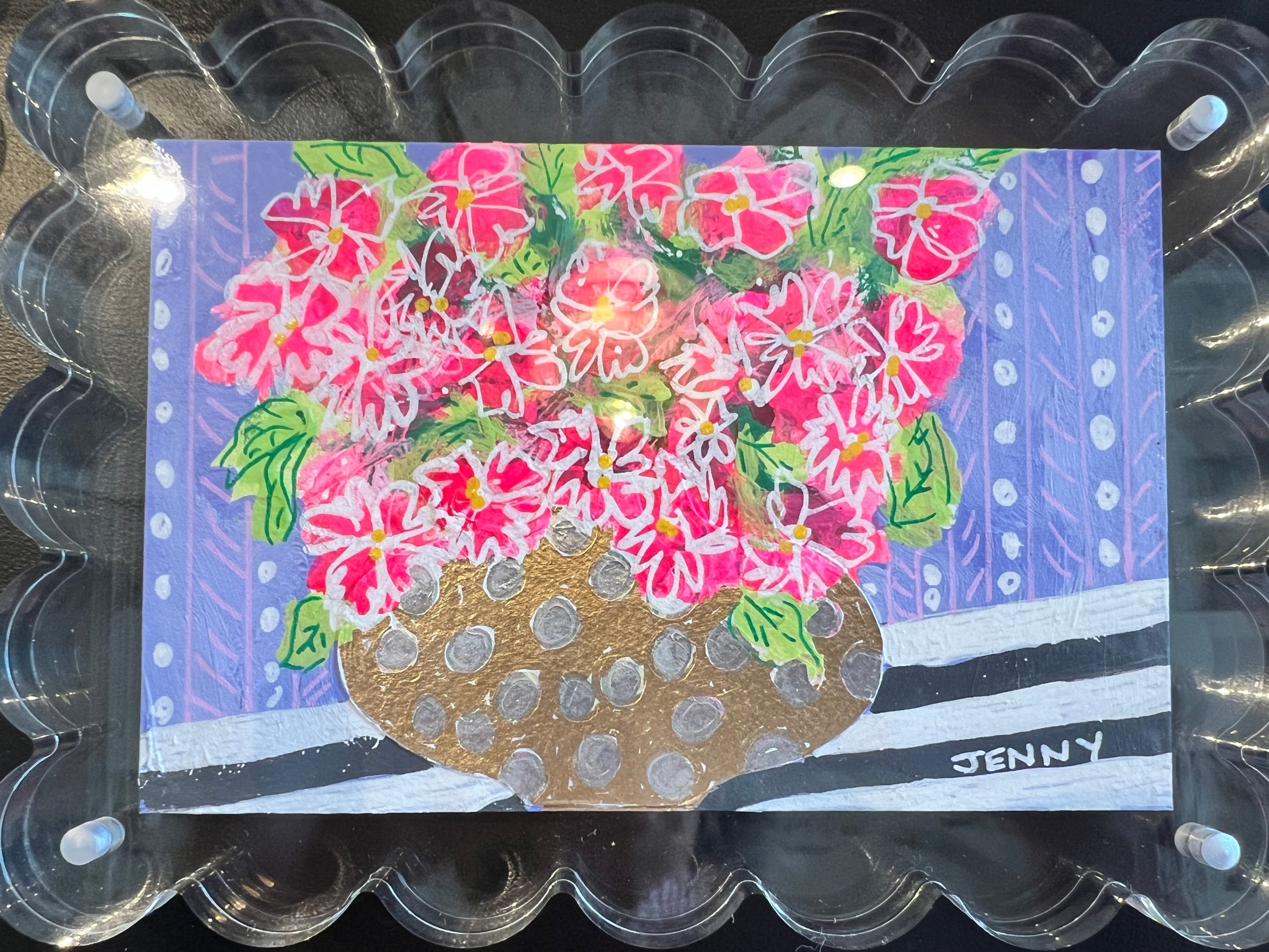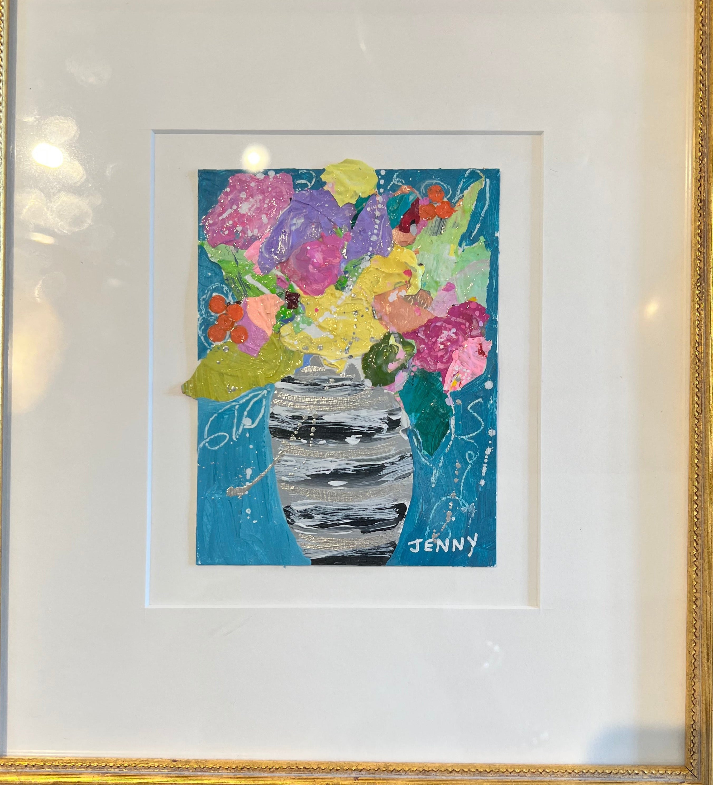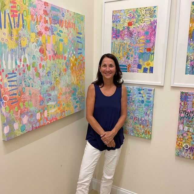 Jenny was raised in Jacksonville, Florida and credits her parents with instilling a creative spirit and artistic drive within her. Her mother taught all her six children the joy of working with diverse media in arts and crafts projects on a regular basis. Her father loved to use his woodworking shop to create different functional designs and encouraged Jenny to learn the basics of construction and form. All of these childhood contributed to her developing a keen sense of space, color, and design. The combination of these parental influences fueled a passion in Jenny to use her talents to create abstracts which feature bursting colors, varied patterns, and a sense of organized motion. The end result is a visually pleasing sense of whimsy and fun that enlivens and brightens the home or wherever it is displayed. Jenny possesses a strong Christian faith that manifests itself in a grateful heart and a loving outlook for the world around her. This spirit is clearly captured in her work. Her paintings bring a sense of joy to the viewer. She hopes her work inspires the viewer to see the beauty and harmony of God’s creation reflected in her canvases. Jenny’s work is shown in boutique galleries, upscale home décor shops, and private collections.