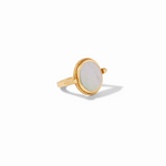Two rings in one! A glistening gemstone of mother of pearl on one side and on the other side a gold coin of a knight on horseback with a CZ sparkle in the horse’s eye.