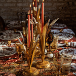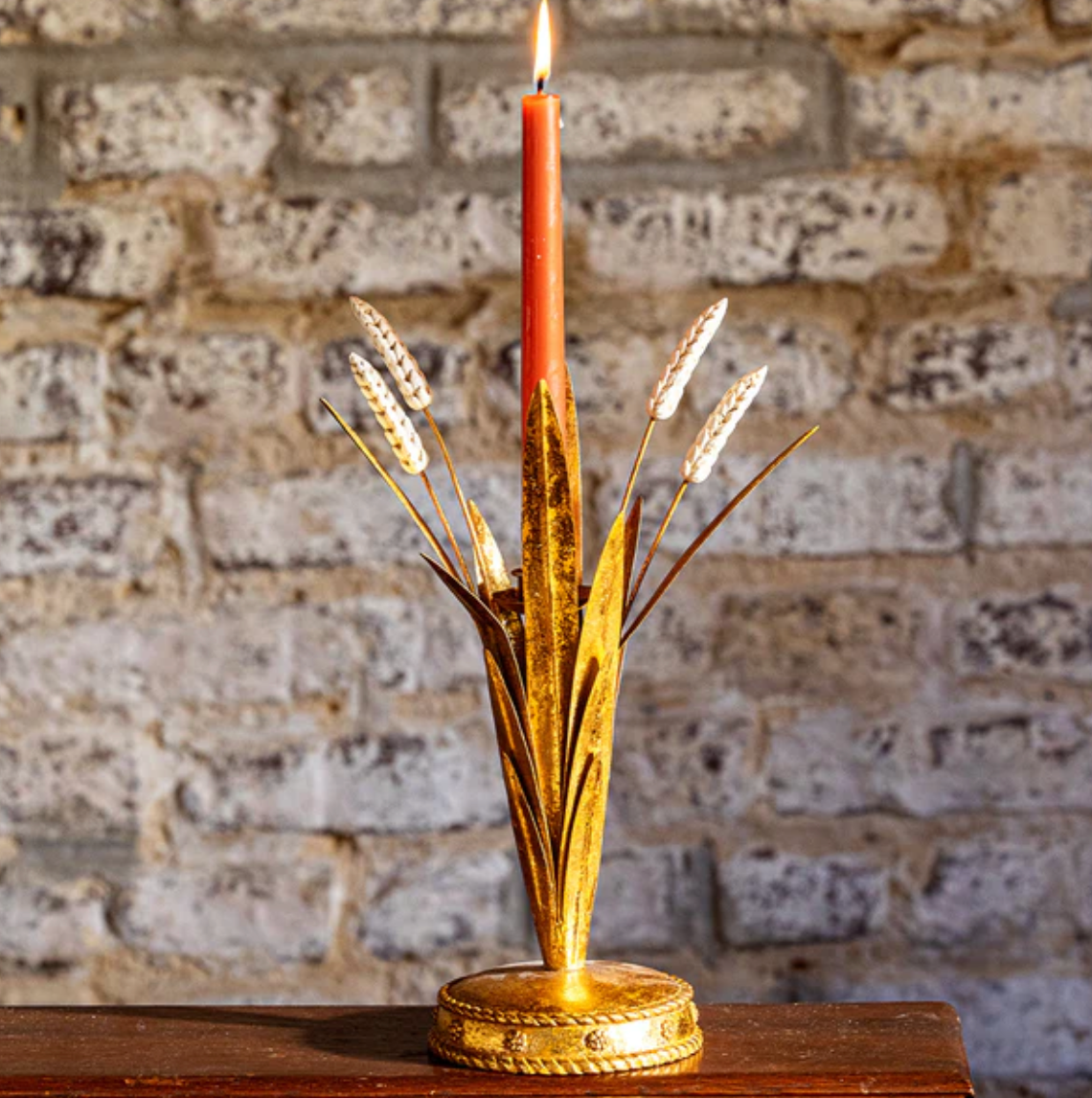 Symbolizing a plentiful harvest, golden sheaves of wheat made of intricately hand-painted metal make this elegant candlestick perfect for celebrating the abundance of the autumn season. Sculptural and luminous, display this on its own for a soft glow or cluster in multiples to create your own centerpiece.