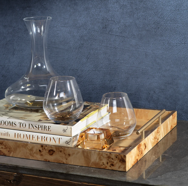 Leiden Burl Wood Design Rectangular Tray with Gold Handles