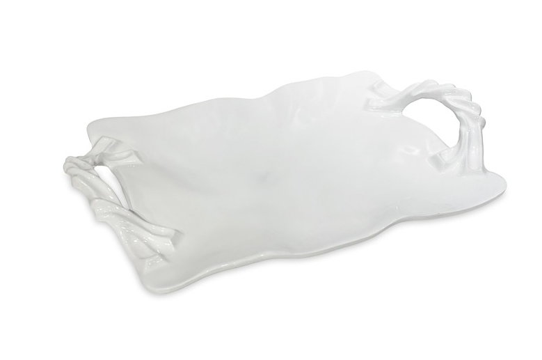 Sculptural form in an ample and practical serving piece. The Beatriz Ball VIDA Sasha Long Rectangle Tray with Handles (White) showcases artfully crafted handles of twisted ribbons, blending beauty with function. Perfect for serving baked goods, cheeses, or small bites in style, this versatile tray also makes a statement when displayed on the bar or kitchen island. Designed for everyday enjoyment, it’s equally at home indoors or outdoors, offering the substance, weight, and appearance of fine ceramics with the ease of melamine. A unique gift and a go-to entertaining piece you’ll reach for time and again. Dishwasher safe (top rack), heavy-weight, food safe, BPA and PABA free.