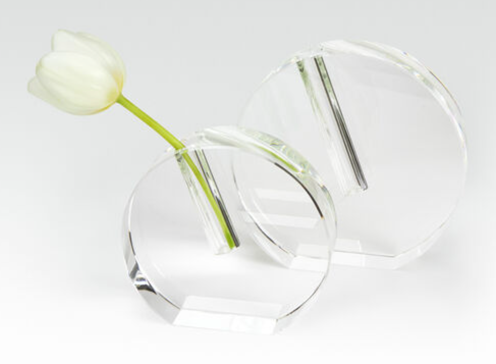 Heavy crystal clear glass bud vase; Flat round profile;1.75″ thick