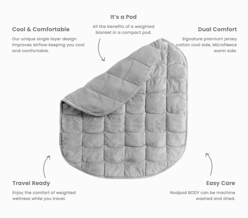 Nodpod BODY's single inner layer construction allows for a cooler, body contouring experience. This allows us to take the weight from a full size weighted blanket to a smaller, portable, machine washable pod. Nodpod BODY can be placed in the freezer for incredible cooling relief. Enjoy the comfort of weighted rest while you travel A weighted blanket makes the perfect Christmas gift, embodying the essence of comfort and relaxation during the holiday season. As a thoughtful holiday gift, it not only adds a touch of luxury to any home but also promotes better sleep and reduces stress, making it a truly meaningful present. Its versatility in Christmas decor allows it to blend seamlessly with festive themes, adding warmth and coziness to any room. Ideal as a substantial gift or even as a deluxe stocking stuffer, a weighted blanket is a unique and cherished item that reflects your care and consideration. This Christmas, give the gift of tranquility and well-being with a weighted blanket.