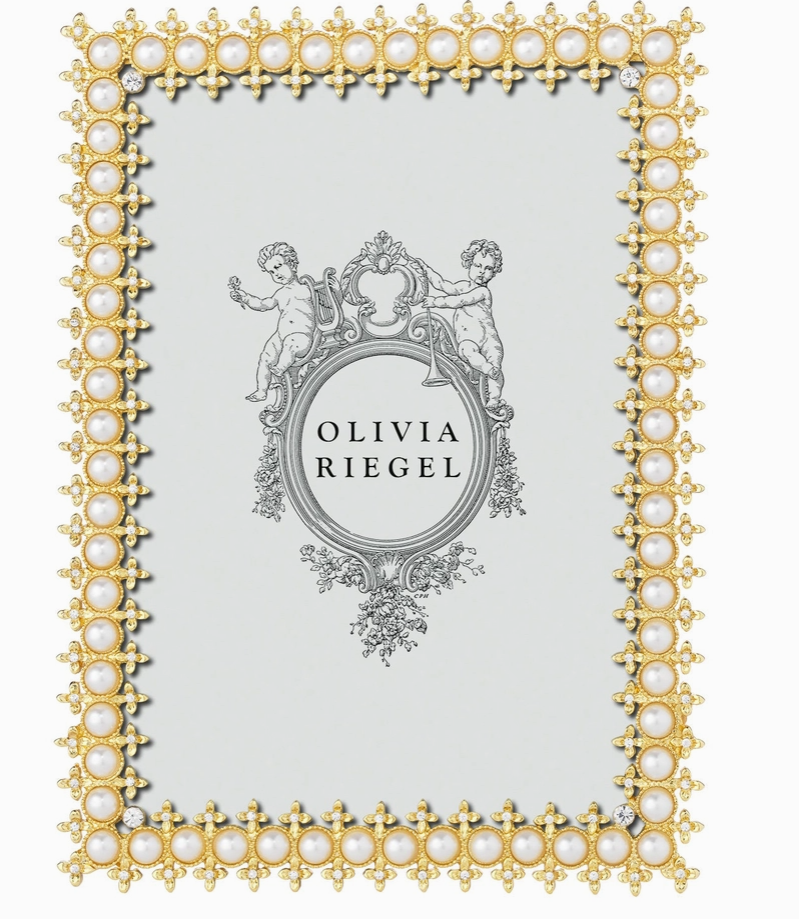 Delicate details with hand-set clear European crystals and faux pearls in metallic finished gold. Elegant moiré silk easel back designed for vertical or horizontal placement. Tarnish resistant. Signature luxury gift box included. "Pearls are always appropriate." -Jackie Kennedy